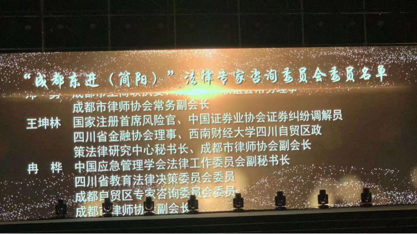 2019年12月,首席合伙人冉桦帮助建立并受聘为“成都东进(简阳)”法律专家咨询委员会委员。