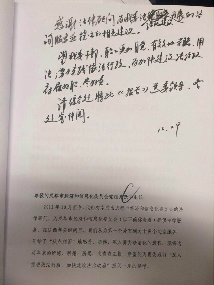 2014年12月,蓉桦律所向成都市经济和信息化委员会呈递《2013-2014法律风险实务报告》,获时任党组书记、主任施跃华同志肯定评价。