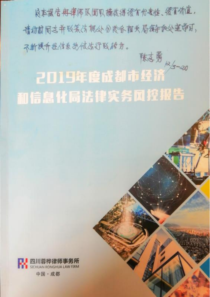 2020年3月,蓉桦律所向成都市经信局呈递《2019年度法律实务风控报告》,并获得中共锦江区委书记陈志勇同志(时任成都市经信局党组书记、局长)高度赞扬。